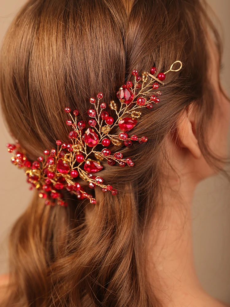 Accesoriu elegant pentru decor par AP002PP Auriu cu cristale Rosii si Aurii + 2 agrafe