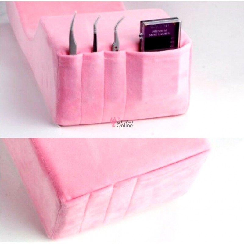Pernă special concepută pentru un machiaj profesional sau extensii de gene, in lateral are un buzunar pentru pensete sau pensule de make-up cat si pentru o cutie de extensii gene fir cu fir.